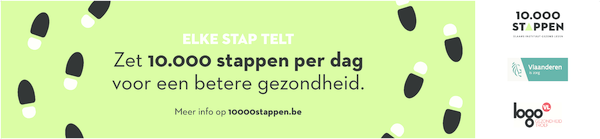Daarom bieden wij u ook dit jaar weer de mogelijkheid om met uw bedrijf deel te nemen aan de 10.000-stappencompetitie: “No steps no glory”. Deze wordt georganiseerd door het Vlaams Instituut Gezond Leven. Ga de uitdaging aan om zoveel mogelijk stappen te zetten in één maand. Winnen kan u doen door samen met de collega’s gedurende die maand de meeste stappen te zetten, of door de meeste deelnemers te hebben. Elke deelnemende werknemer streeft ernaar om 10.000 stappen per dag te zetten, of meer natuuurlijk...
